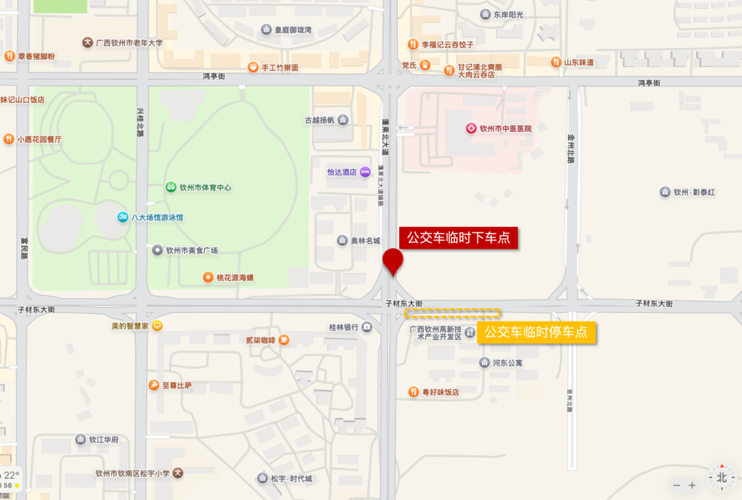 从钦州东站出站后,可乘坐8路、K8路、T802/806路公交车,到体育中心附近的站点下车,步行即可到达