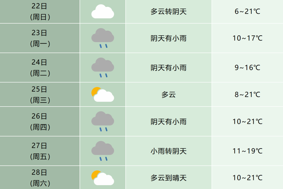 3月22日(周日):淮河以北地区为多云天气;淮河以南地区从多云转为阴天,江淮之间西部和江南部分地区有小雨。