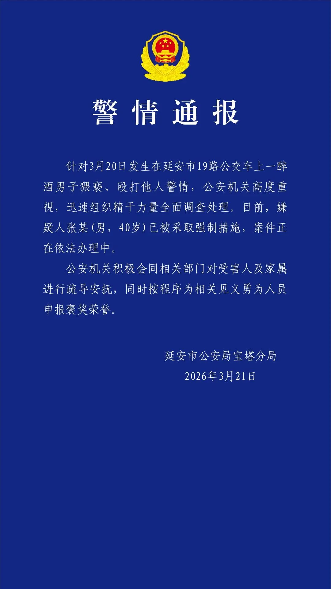 针对3月20日延安市19路公交车上醉酒男子猥亵、殴打他人的警情,公安机关高度重视,迅速组织精干力量展开全面调查处理。目前,嫌疑人张某(男,40岁)已被依法采取强制措施,案件正按法定程序办理。