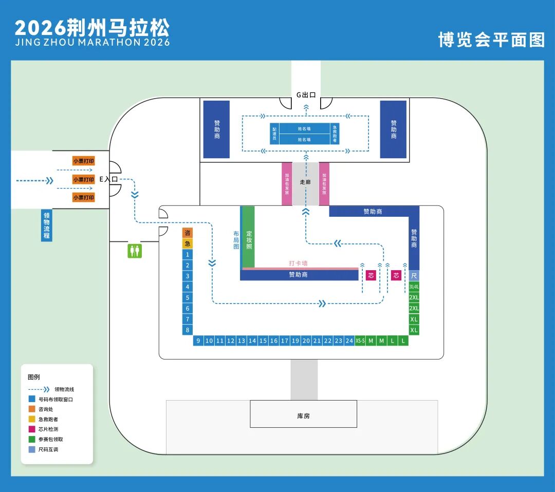 请按照物资领取平面示意图的箭头方向行进,前往对应区域领取参赛物品。