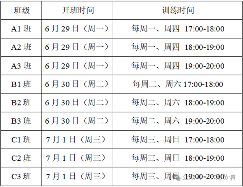 第一期计划2026年6月29日至8月30日开班(每周2次,每次60分钟,设周一、周四班;周二、周六班;周三、周日班,具体见训练时间安排表);第二期时间另行通知。