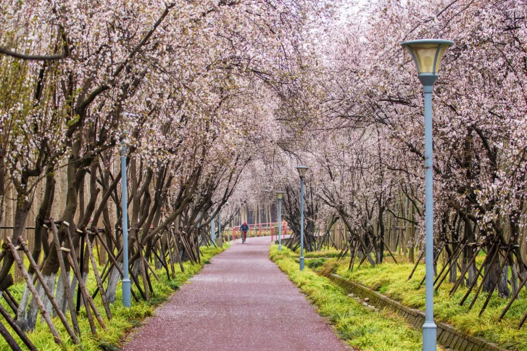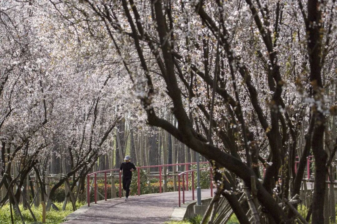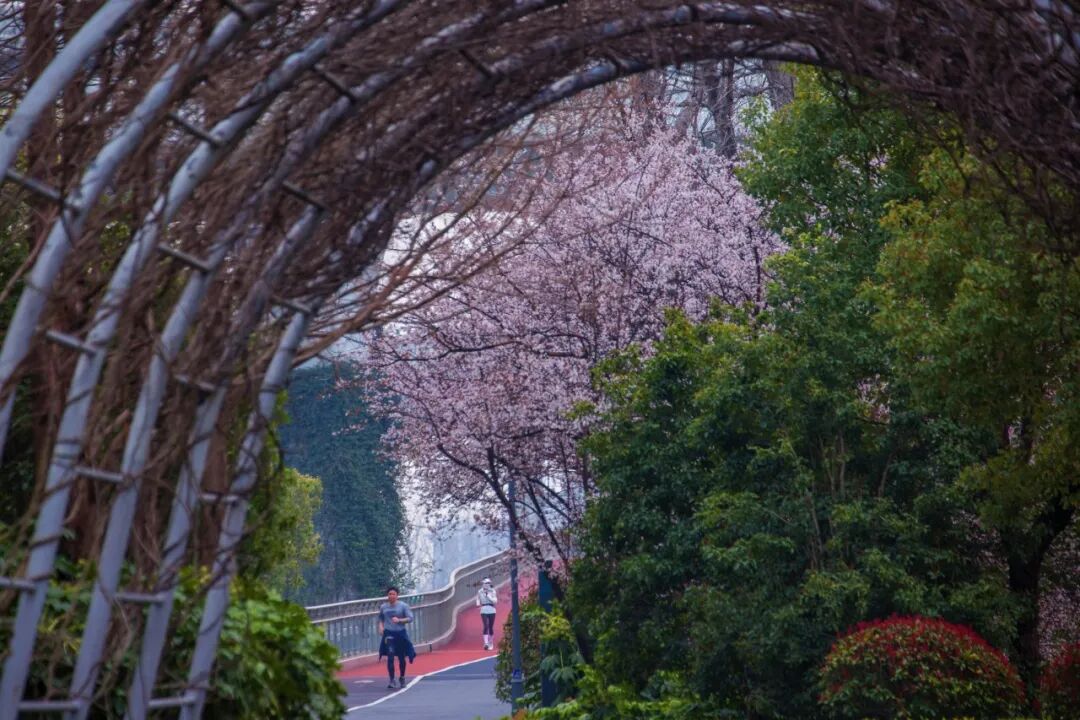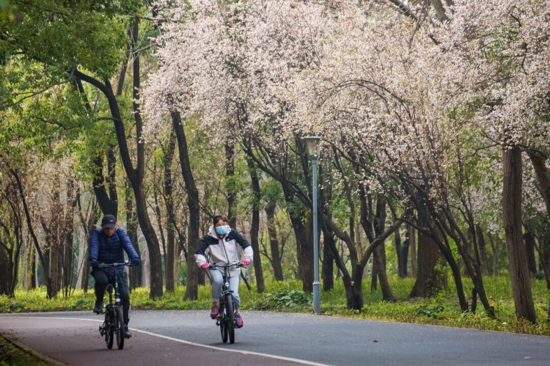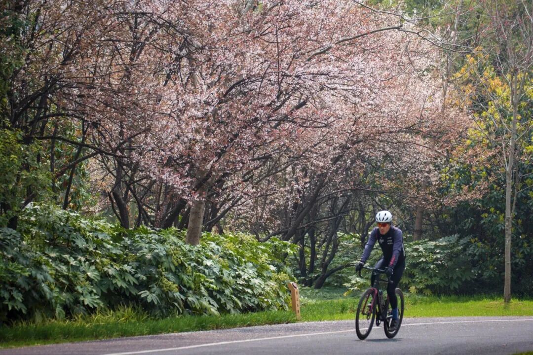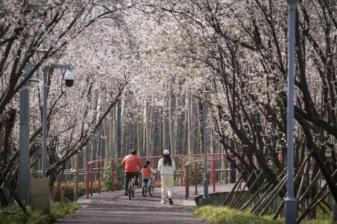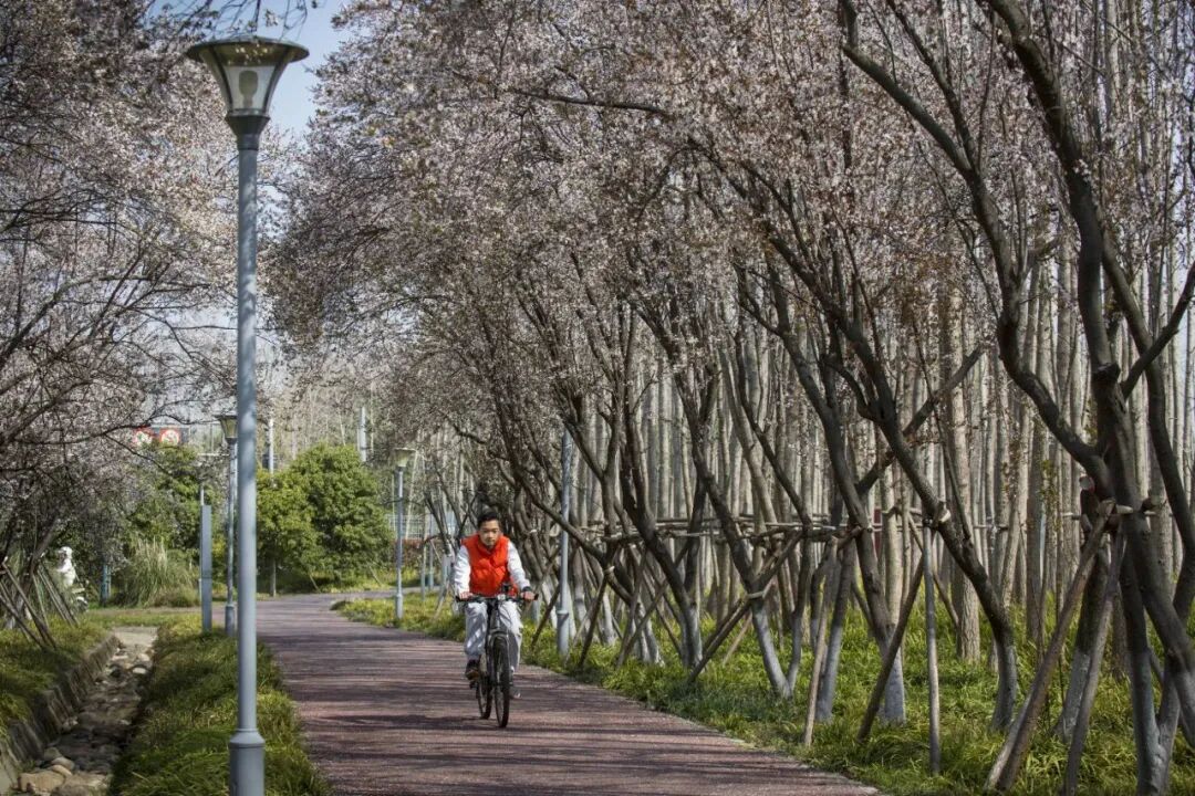 绿道沿线的紫叶李也开得十分艳丽。漫步在其中,不用拥挤,就能悠闲地享受这浪漫的春光。