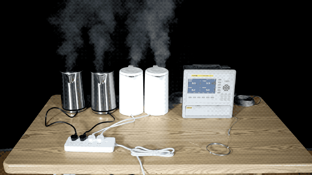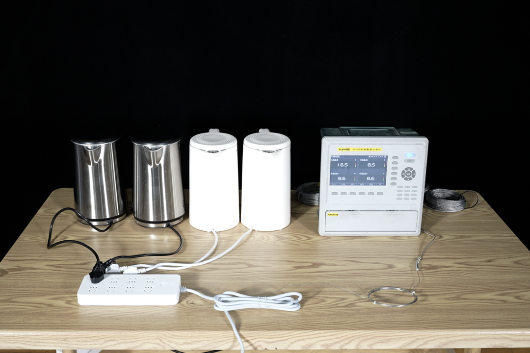 消防员把四台同规格的电热水壶插在同一个国标插线板上,用捆扎带将电线绑在一起,倒入等量水后让四台水壶同时工作,实时监测电线温度。随着时间推移,电线开始冒出青烟。