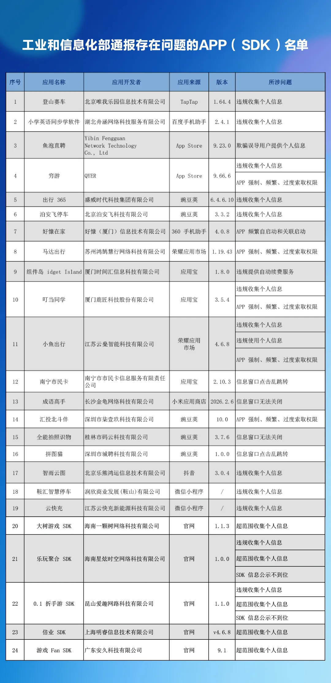 为了规范市场秩序、守护用户隐私,工业和信息化部持续开展APP侵害用户权益专项整治行动。近期,通过组织第三方检测机构抽查,共发现24款APP(SDK)存在侵害用户权益的行为。快和小移一起看看,及时规避风险。