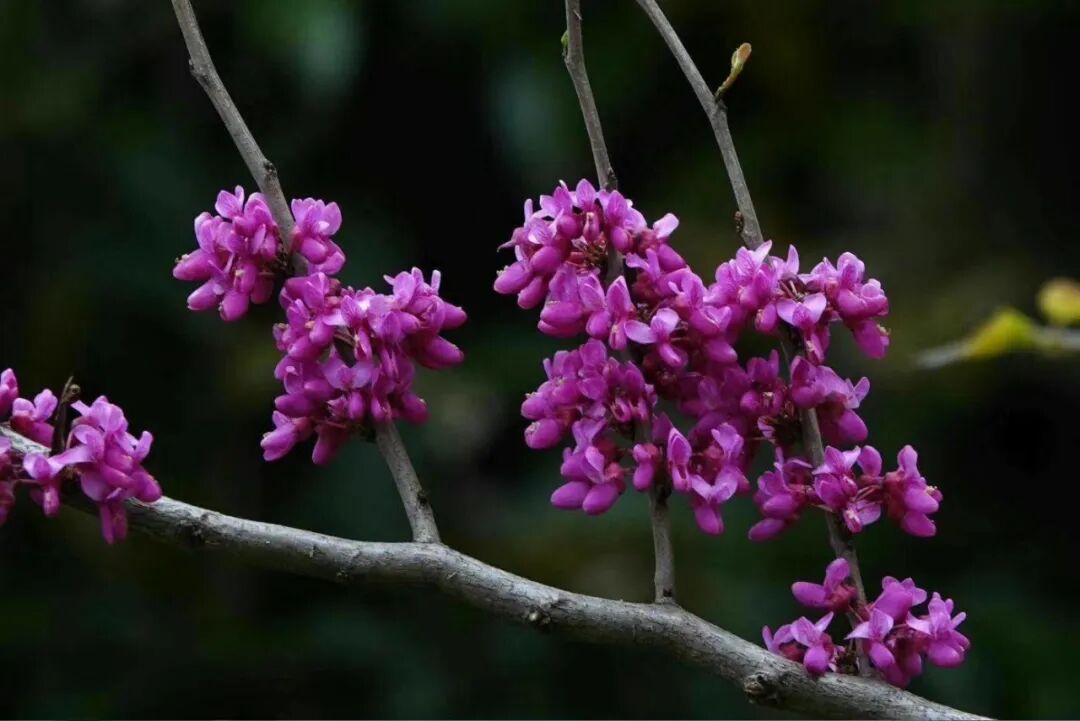 抬头看,紫荆花簇拥在枝头,开得热烈奔放;低头瞧,灯笼花小巧玲珑十分可爱,还有那星星点点的阿拉伯婆婆纳在草地上闪烁着蓝色的光芒,它们一起编织成了一幅层次丰富、色彩绚丽的田野画卷。
