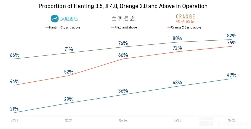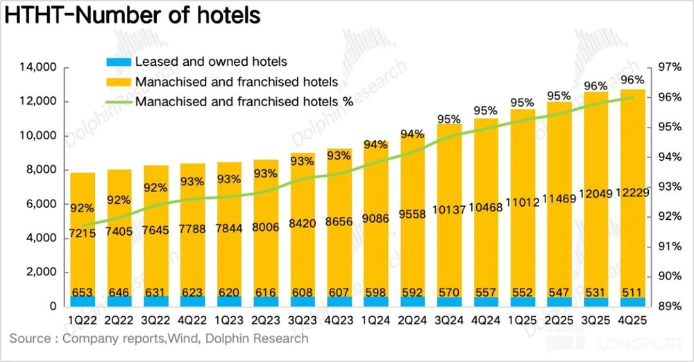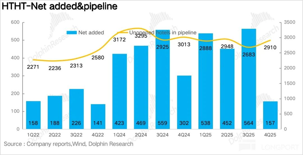 四季度净新增157家店,节奏放缓。华住主动抬高加盟门槛,加盟商因单店回本周期延长更谨慎。结构上,桔子水晶、漫心、美仑等中高端品牌新开业增速超集团平均,是结构升级核心;汉庭等经济型品牌以翻新为主。待开业管道超50%位于三线及以下城市,华住将中高端产品带入县域市场,获取连锁化红利。背后反映缺乏品牌、会员和技术支撑的单体酒店加速淘汰,优质资产向头部连锁品牌集中。