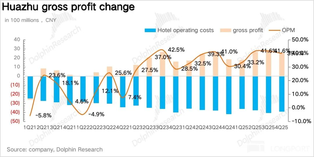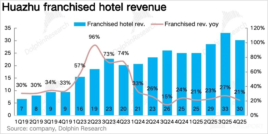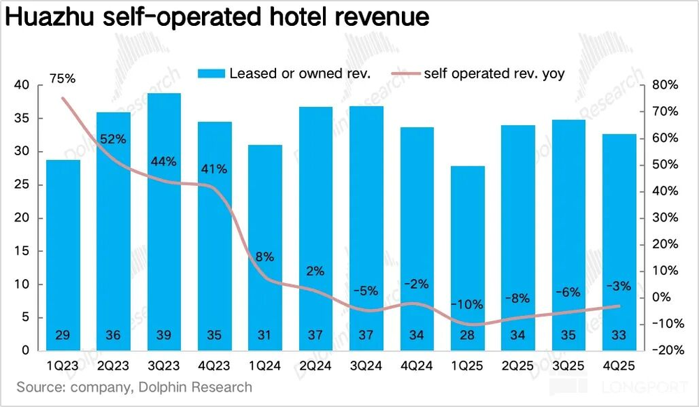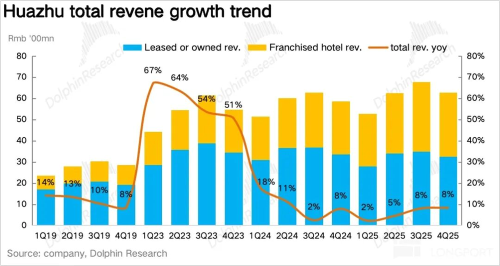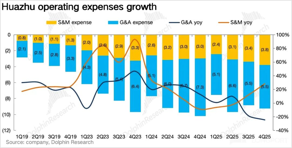 四季度营收65.3亿元,同比增长8.3%,超出2%-6%指引上限。拆分业务:加盟业务受益供应链整合与加盟商签约强劲,同比增长21%,占比提升4.8个百分点至46.3%,符合市场预期;直营业务营收32.7亿元,同比下滑3.2%但降速收窄,小幅超预期,推测禧玥、花间堂等高端直营酒店表现优异。