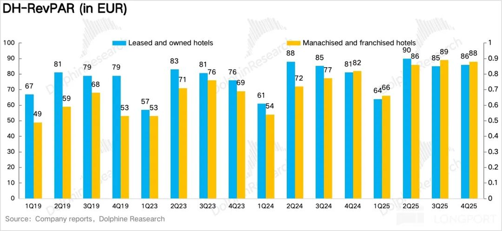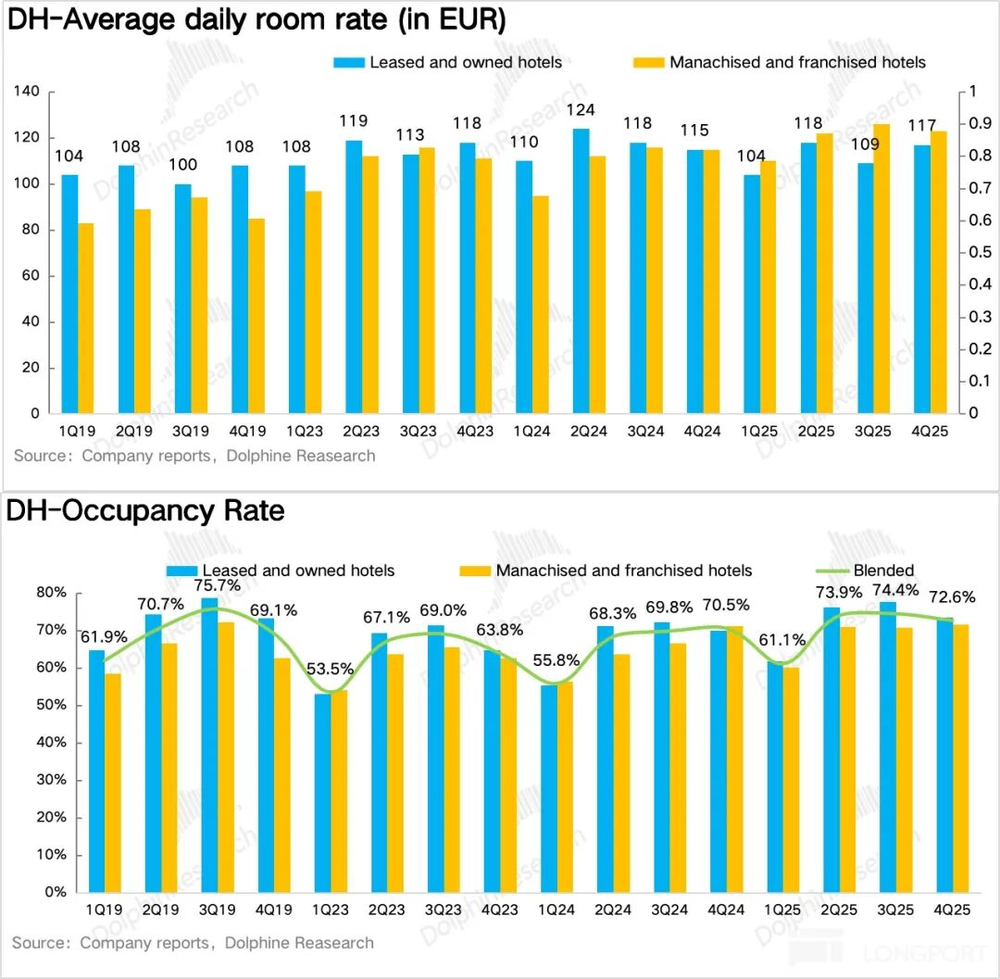1、RevPAR环比持续修复。核心经营指标每间可售房收入(RevPAR)同比增长1.8%,延续三季度正增长态势且环比略有提速。量价拆分显示,旧店翻新及高价品牌(桔子水晶、漫心、城际)占比提升推动平均日房价(ADR)同比增长4%,成为核心驱动;入住率(OCC)同比下滑1.6%,表现一般。欧洲市场受年末商务展会与圣诞假期拉动,RevPAR同比增长7.4%,ADR同比增长4.3%,入住率增速环比回落。