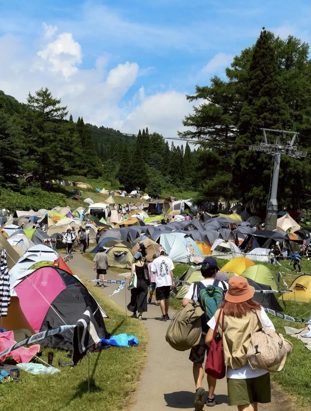 「大家都得自己搭帐篷、铺睡袋。现场天气难以预测,舞台间要走10分钟左右山路,最实用的穿搭是速干衣裤、毛巾和凉鞋。演出间隙,还得规划下一顿吃什么、在哪吃,要不要趁人少去淋浴间。」参加过FUJI ROCK的十元(化名)告诉我们。