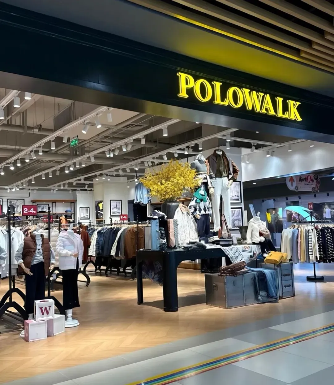 POLO WALK选址在万达、万象汇等平民商场,选租金低的楼层或中庭。李雪去的店在三楼挨着童装区,石头哥逛的在二楼拐角,周边是优衣库、无印良品等大众品牌。
