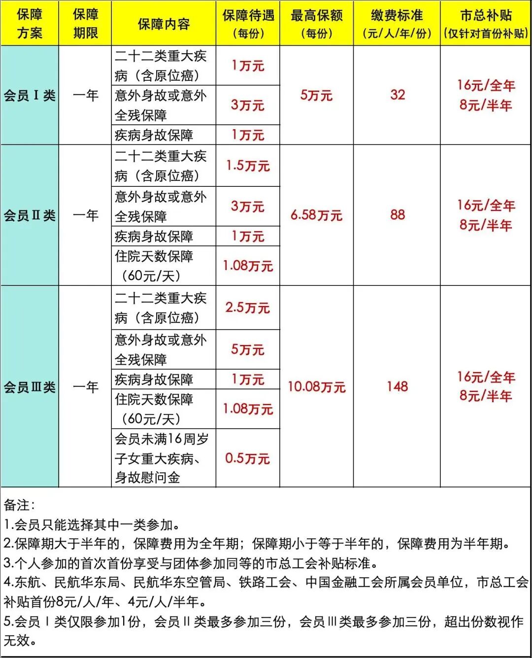 保障内容方面,会员保障分为会员Ⅰ类、会员Ⅱ类、会员Ⅲ类三个层级。团体或个人参保的会员,可根据单位工会安排和自身实际选择一类参加。一个保障期限内,工会会员只能参保一次,且三类保障只能选其一;会员Ⅰ类仅限1份,会员Ⅱ类和Ⅲ类最多各3份,超出份数无效。