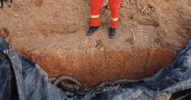 果园蓄水池惊现三条缠绕蟒蛇,消防员:一个袋子装不下