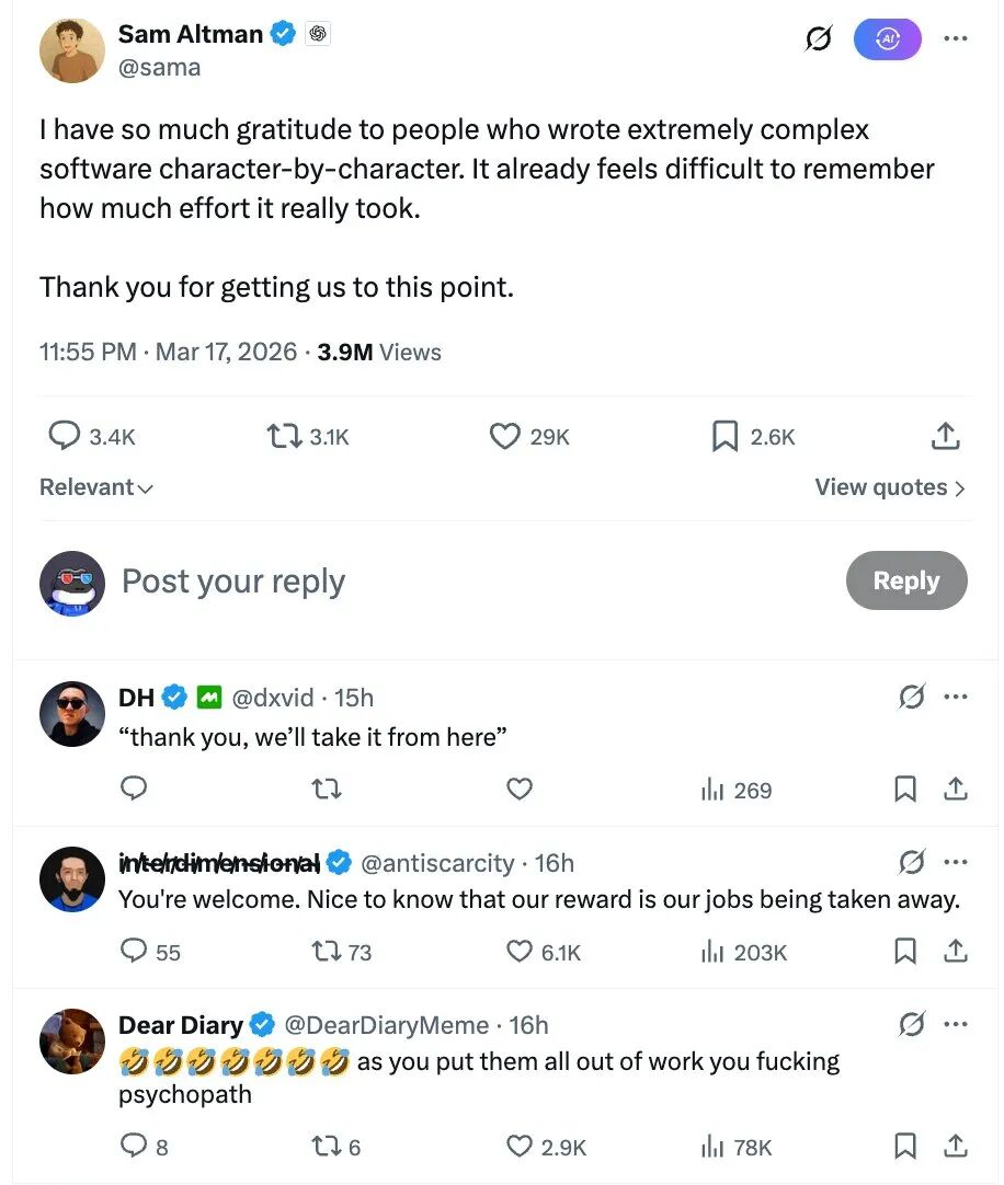 奥特曼感谢程序员“逐字写代码”,让我们走到了今天,引发众怒
