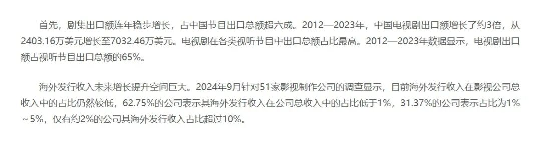 根据国家广电总局发布的《2024年中国剧集发展报告》,中国电视剧出口额连年稳步增长。2012年至2023年,中国电视剧出口额增长了约3倍,从2403.16万美元增长至7032.46万美元。这些数字背后,是一个不可逆转的趋势:国剧出海已从锦上添花变为行业的战略必选项。