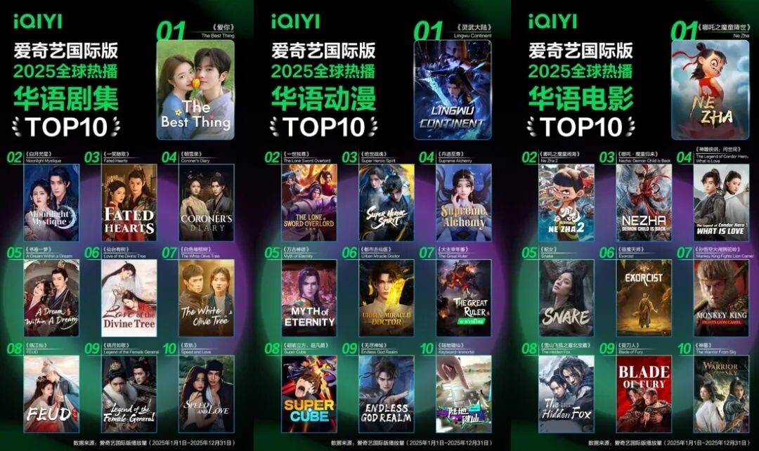 爱奇艺方面,在年初发布的“爱奇艺国际版2025年全球热播榜”中,古装剧占据七席。其中,《白月梵星》在韩国、日本、东南亚等15个国家与地区登顶热播榜,《一笑随歌》《朝雪录》等作品也凭借独特的视觉美学与深厚的文化底蕴,获得了海外观众的认可。