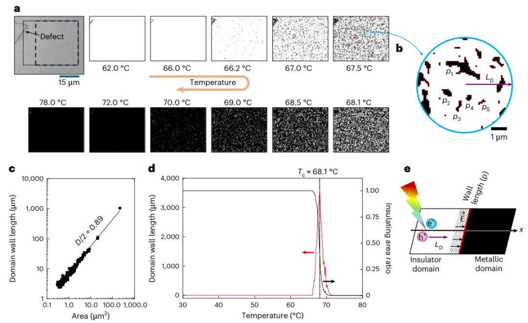1. 为探究产率随温度变化的规律,研究通过光学反射率测量分析相变的空间演化。追踪温度扫描中光学图像各像素点强度变化,从每条曲线中点确定绝缘体-金属相变发生,生成二值化阈值图像(绝缘域白色、金属域黑色)。66℃以下时VO₂薄膜呈绝缘态;超过该温度后黑色像素点出现,金属域开始嵌入绝缘薄膜(图3a)。金属域尺寸和数量迅速增加,至72℃时除缺陷区域外薄膜完全金属化。关键参数畴壁长度为各金属域周长总和(图3b)。绝缘体-金属相变点的产率可通过绝缘域与金属域边界形成的结阵列解释:电子-空穴对在绝缘域以速率G光生后进行扩散运动(图3e),若载流子在复合前抵达结界面,将被内建电场有效分离。