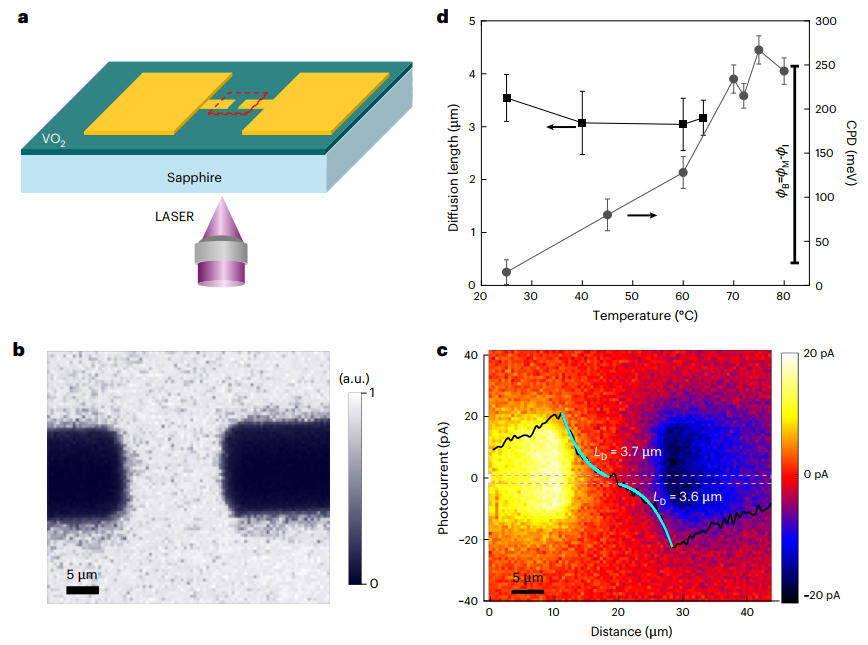 1. 当载流子扩散长度大于相邻金属畴平均距离时,载流子复合损失可降至最低。研究采用扫描光电流显微镜研究载流子扩散长度(图4a),通过在VO₂薄膜上热蒸镀间距12微米的金电极(图4b光学透射图像)构建宏观肖特基结模拟绝缘体-金属结。远低于相变阈值的激光功率照射下,该结构能有效分离光生载流子。光电流分布图(图4c)显示每个电极附近检测到高强度正负光电流信号,跨间隙区域的光电流空间分布符合指数衰减规律,表明光电流主要由结区外扩散机制主导,拟合得载流子扩散长度约3.6微米。温度升高至相变临界温度时,载流子扩散长度无显著变化(图4d),因此载流子扩散长度大于相邻金属畴平均间距(图3b),迫使光生少数载流子参与反应。