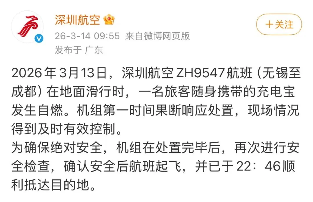 近日,深圳航空一架从无锡飞往成都的航班在地面滑行准备起飞时,一名旅客随身携带的充电宝突然发生自燃。这一事件引发了公众对航空出行中充电宝安全问题的高度关注。