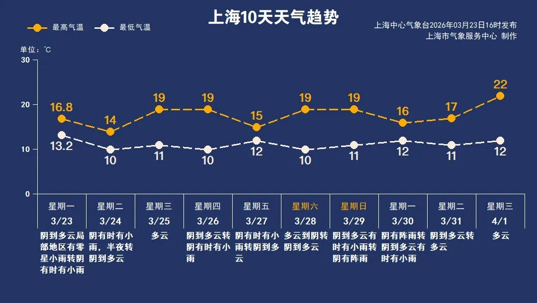 西南暖湿气流较为活跃,本周申城天气在多云、阴天与雨水间交替。主要降水过程集中在周四夜间至周五白天和周日前后。本周最低气温稳定在10~12℃,最高气温略有波动,周中和双休日最高气温预计可达19℃,整体体感偏暖湿;周五受雨水影响,最高气温降至15℃。春季天气变化多端,建议大家及时关注最新天气信息。