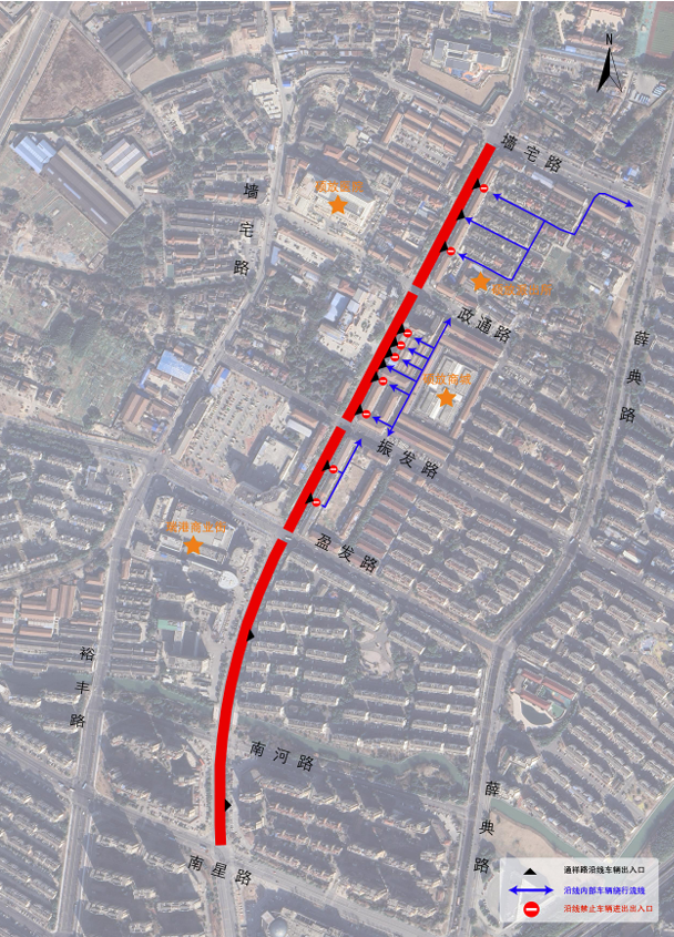 通祥一村通祥路段保留一进一出两个通道,其他车辆可经墙宅路进出;菜场周边可绕行行政通路、振发路;通祥三村可绕行振发路、盈发路。