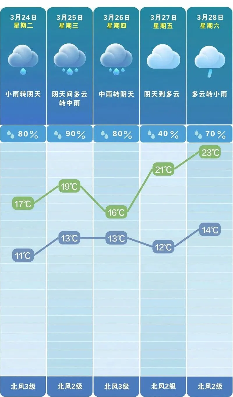 中间几天的雨是“绵绵不断”的节奏:24日小雨转阴天,北风3级,气温11℃到17℃;25日阴天间多云转中雨,13℃至19℃,出门一定要带伞;26日中雨转阴天,13℃到16℃,全天阴冷,建议穿防水鞋;27日是本周唯一的好天气,阴天到多云,气温回升至12℃至21℃,洗晒、出门、遛弯都可以安排,错过又得等;28日多云转小雨,14℃至23℃,要提防被雨水“突然袭击”;29日长沙有大雨,14℃到18℃,宅在家里最稳妥。