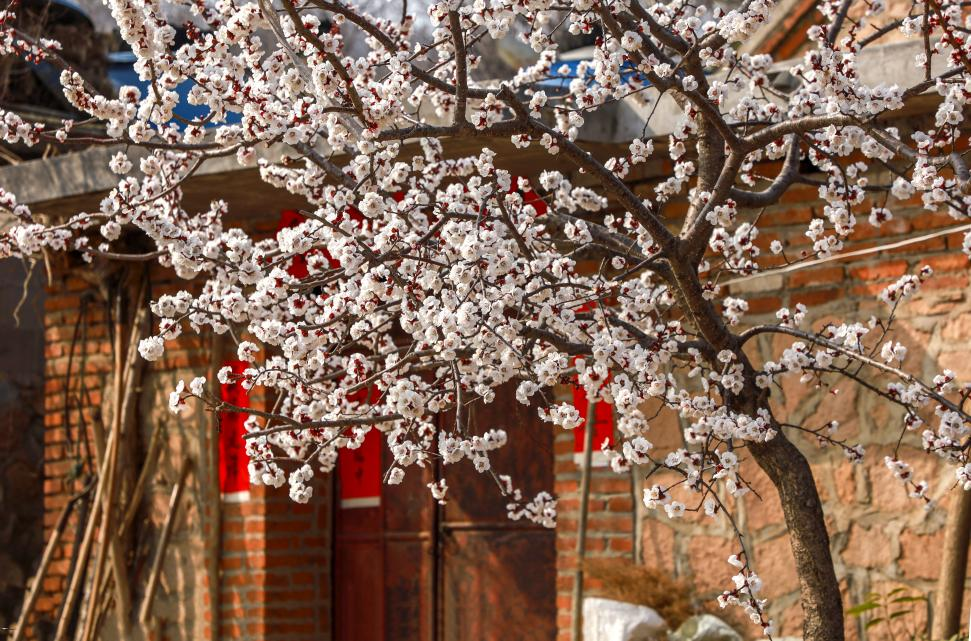 红砖木门与白色樱花相互映衬,花枝带着红联的暖意。厉新昌 摄