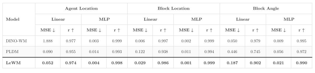 模型将画面转换为特征向量(latent)后,团队在训练好的LeWM后接入一个简单探测器,使其仅依靠latent向量预测机器人/方块的位置、方块角度、机械臂指尖坐标。