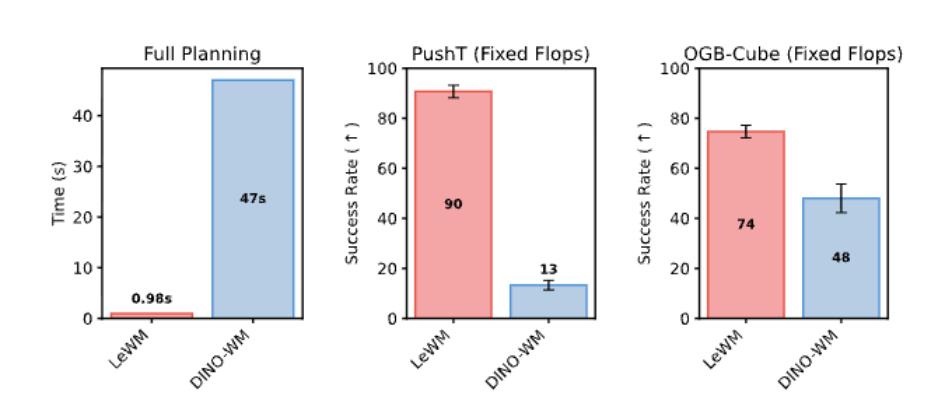 值得注意的是,LeWM的规划速度比DINO-WM快48倍:前者不到1秒,后者约需47秒。