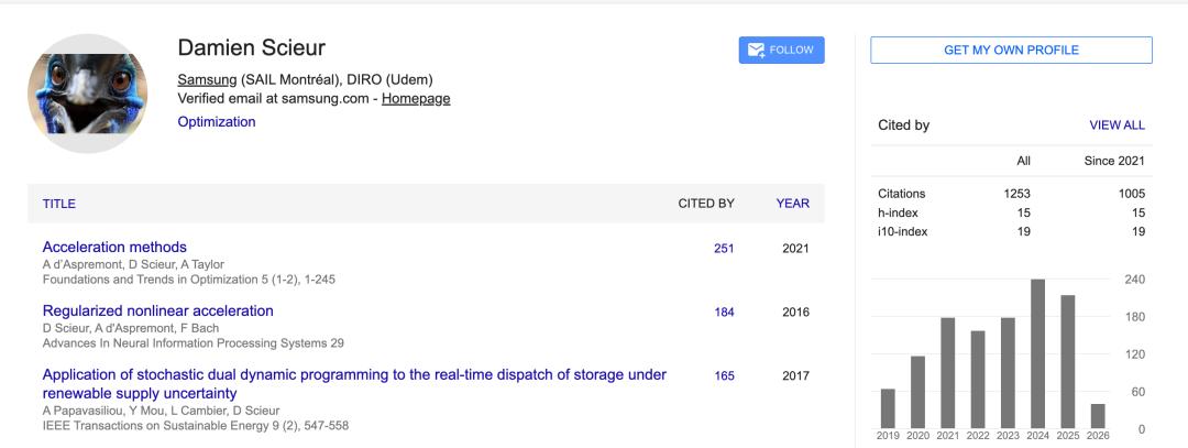 Damien Scieur现任三星研究员,曾任普林斯顿大学博士后,主要研究方向为优化算法。