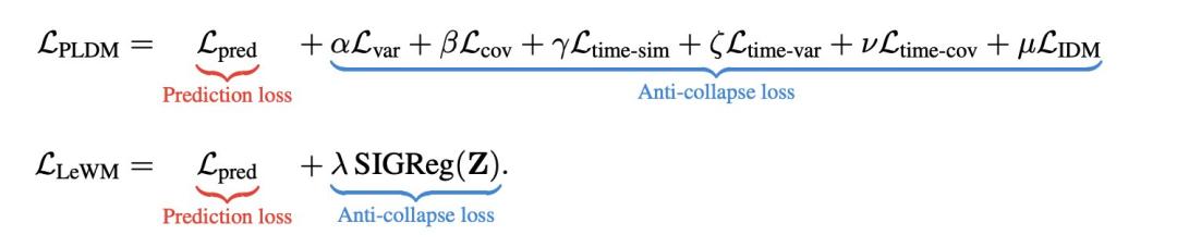 SIGReg正则损失:强制所有特征向量服从标准高斯分布,防止模型出现“摆烂坍塌”(即所有画面输出相同特征)的情况。