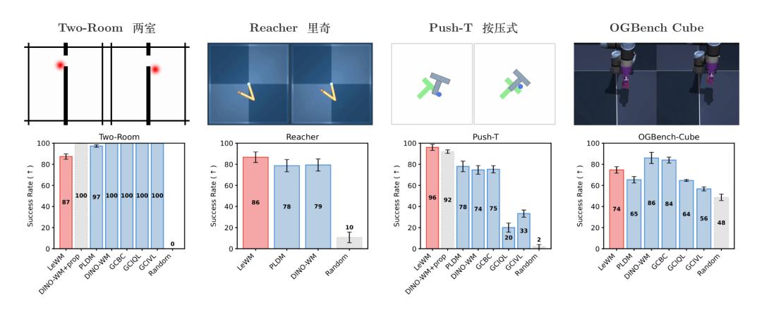 团队在4个经典机器人/控制任务上进行测试,并与DINO-WM和PLDM这两种基于JEPA的先进方法对比。这4个任务分别是Push-T(推箱子)、Reacher(机械臂够取目标)、OGBench-Cube(3D机械臂抓取方块)、Two-Room(2D导航)。