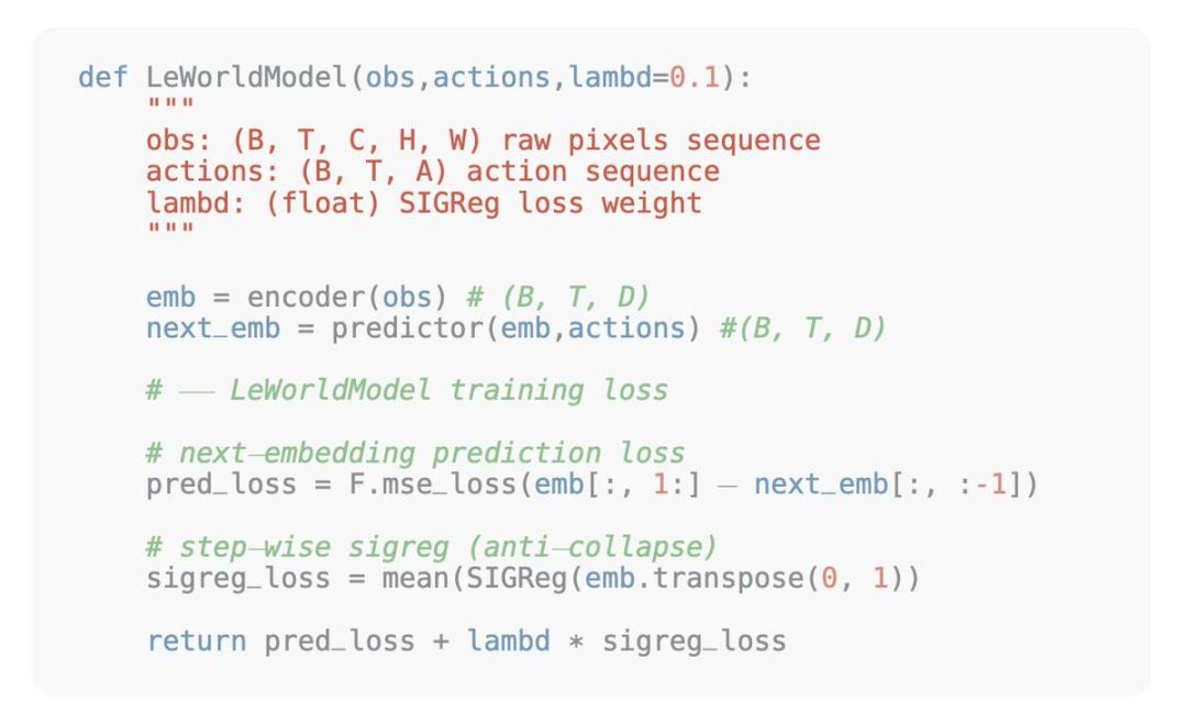 而LeWM的设计思路是将JEPA简化至核心本质:利用编码器将图片转换为特征,通过预测器根据动作预测下一个特征,再借助高斯正则化防止模型坍塌,全程采用端到端方式,实现极简且稳定的训练。