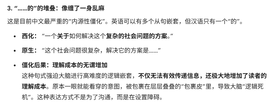 这才是最令我脊背发凉的地方:这种僵化正在钝化我们的审美,更在透支我们的认知。翻译腔实际上为写作者提供了廉价的避风港。写作者通过堆砌复杂长定语和被动语态,将简单甚至荒谬的逻辑包装成“严谨专业”的假象;而读者在被迫处理这些层层嵌套的句式时,大脑承受着剧烈的认知损耗。