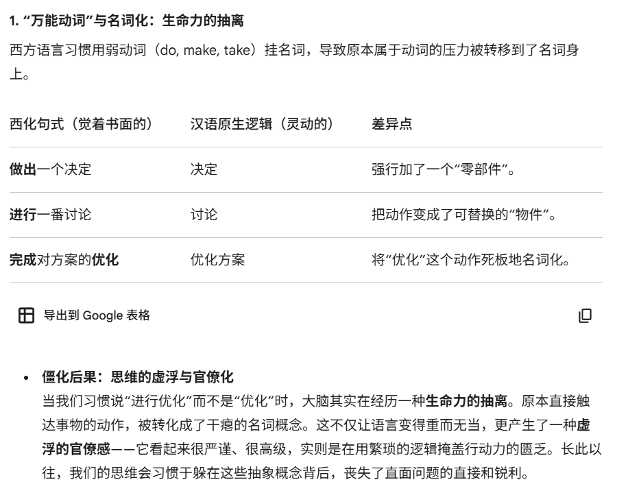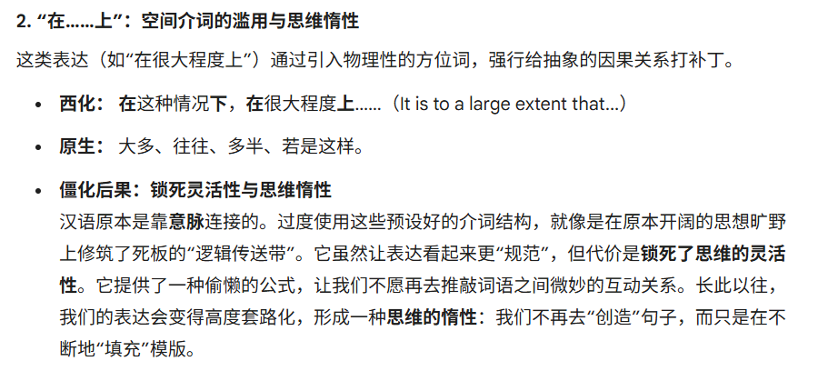 事实上,我一开始甚至没意识到这个问题,直到和AI讨论时,它抛出“在很大程度上”“做出一个……的决定”这两个句式——我潜意识里早已把它们当成正常中文表达,而AI点醒了我:这种逻辑其实是英语骨架披着汉字外皮,中文里明明有“多半”“往往”和直接的“决定”,为何要绕弯子?