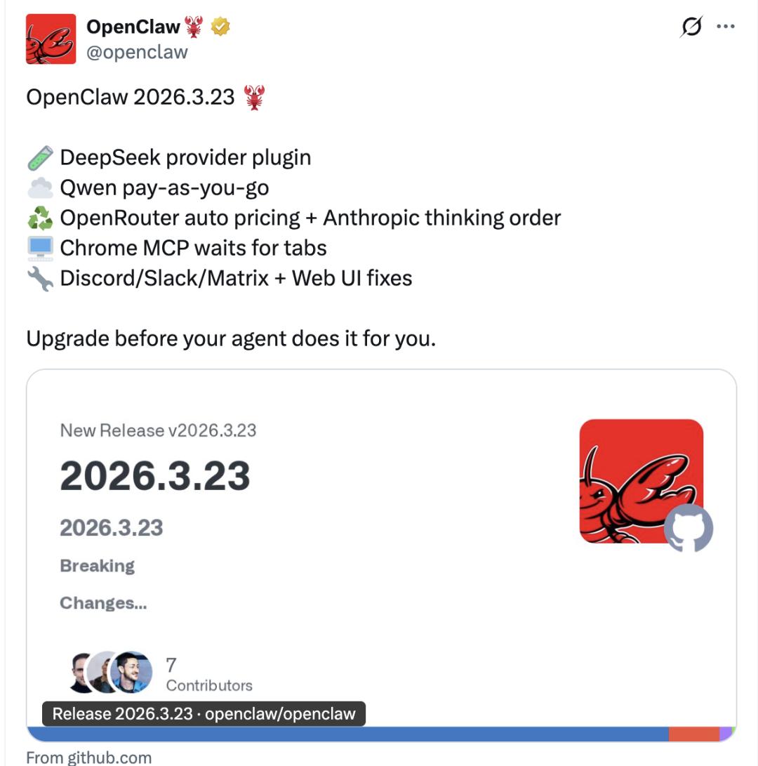 刚刚,龙虾迅速更新至OpenClaw 2026.3.23版本。
