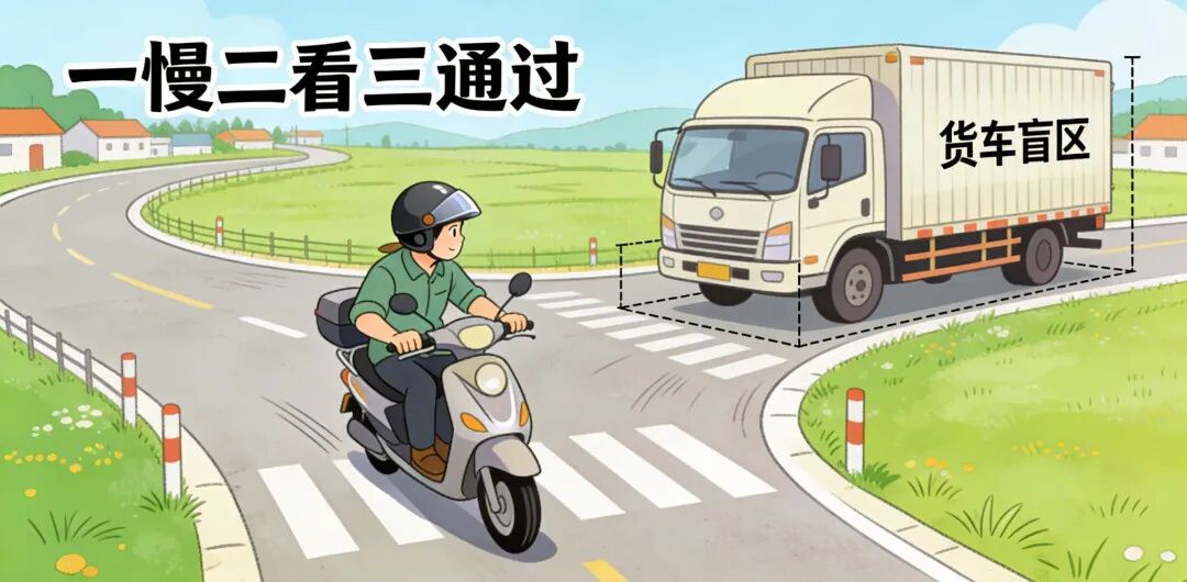 村口、路口和弯道处视线容易被遮挡,车辆交汇时如果不减速观察,甚至突然转弯,很容易引发碰撞事故。不管路口有没有信号灯,驾驶人都要牢记“一慢二看三通过”,减速备刹,仔细观察,确认安全后再通行。尤其要注意和大型车辆保持安全距离,远离视觉盲区。