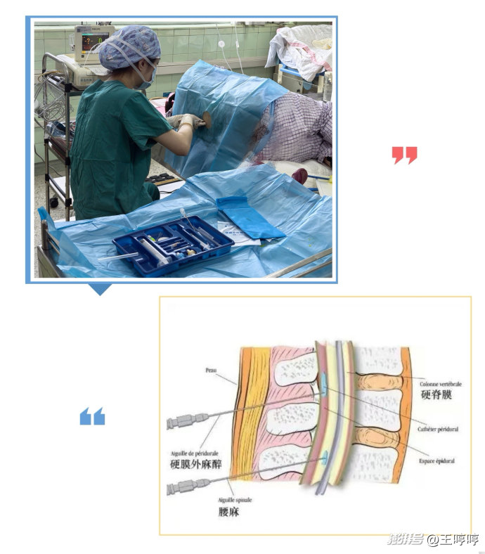 麻醉医生会在产妇后背的腰椎间隙进行穿刺,将麻醉药物注入椎管内,阻断下半身的痛觉神经传导。