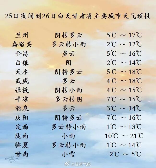 3月25日20时到3月26日20时,甘南、定西、陇南、天水等市州天气为阴,部分区域会有小雪(雨)或者雨夹雪;兰州、临夏、平凉这三个市州由阴转多云,局部区域有小雨或者雨夹雪;省内其他地区是多云天气,祁连山区为阴且有小雪。此外,河西五市会有4到5级的西北风。
