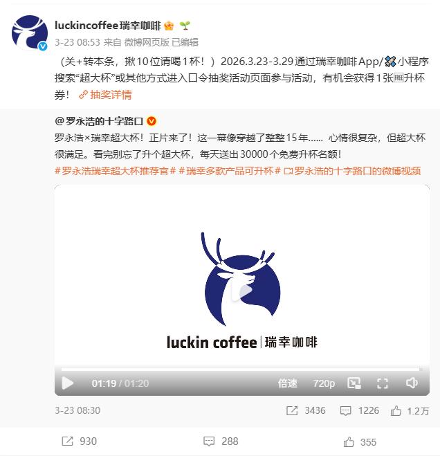 为何是罗永浩?按传统流量代言逻辑,2026年的他并非首选,甚至有争议,但这次TVC却非他不可。瑞幸的核心目的是推广“+3元升超大杯”策略,拉高客单价。而罗永浩因当年的杯型纠纷,成了“被咖啡店套路逼疯的消费者”代言人,能精准传递“无套路、透明升杯”的信息,无需过多广告词就能让消费者理解“加价加量”的价值。广告中,他与当年的店员同框,这种反差引发自主传播,获得消费者好感。
