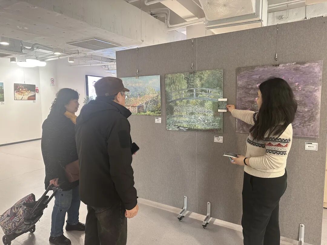 二楼“艺汇凌云”展厅内,《睡莲》的朦胧紫绿晕染出水面的粼粼波光,《春天的花》以浓艳饱满的笔触勾勒出春日盛放的蓬勃生机,《船上画室中的莫奈》则定格了塞纳河畔的创作瞬间。社区居民们凑近仔细端详,艺术的温度在充满烟火气的空间里缓缓流淌。
