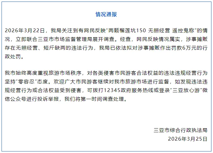 据“三亚发布”微信公众号消息,3月25日,三亚市综合行政执法局发布情况通报称,2026年3月22日,该局关注到网民反映“两颗榴莲坑150 无照经营 遥控鬼秤”的情况后,立即联合三亚市市场监督管理局开展调查。经核实,网民反映的情况属实,涉事摊贩存在无照经营、短斤缺两的违法行为,目前已依法拟对其作出罚款6万元的行政处罚。