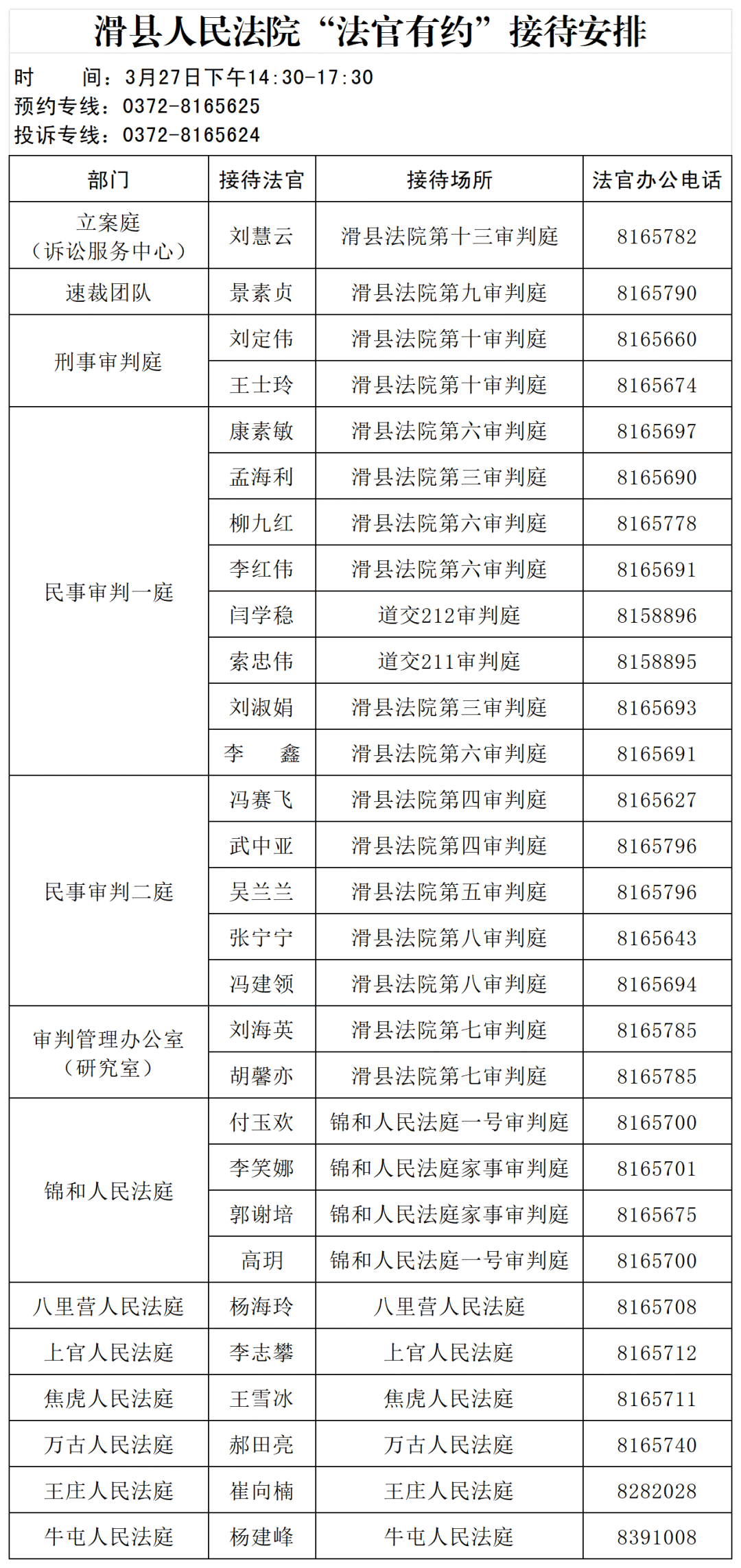 滑县法院“法官有约”固定接待日安排公告