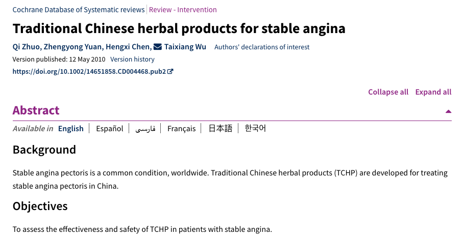 论文作者检索了当时的各类文献和临床试验资料库,仅找到3个方法学合格的中药治疗心绞痛研究。这三项研究规模很小,受试者总人数仅216人,作者认为现有证据无法证明中药治疗心绞痛有效。