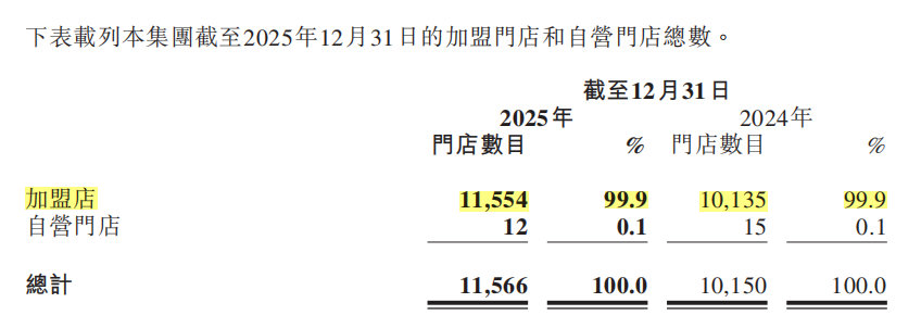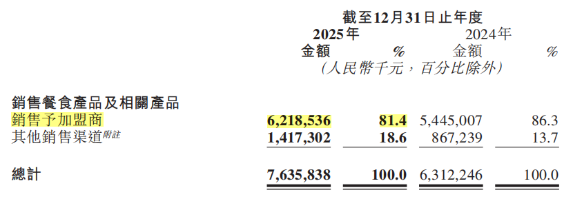 2025年数据清晰体现:11566家门店中,11554家是加盟店,占比99.9%。“销售餐食及相关产品”76.35亿元收入中,62.2亿元来自加盟商,占比超八成。