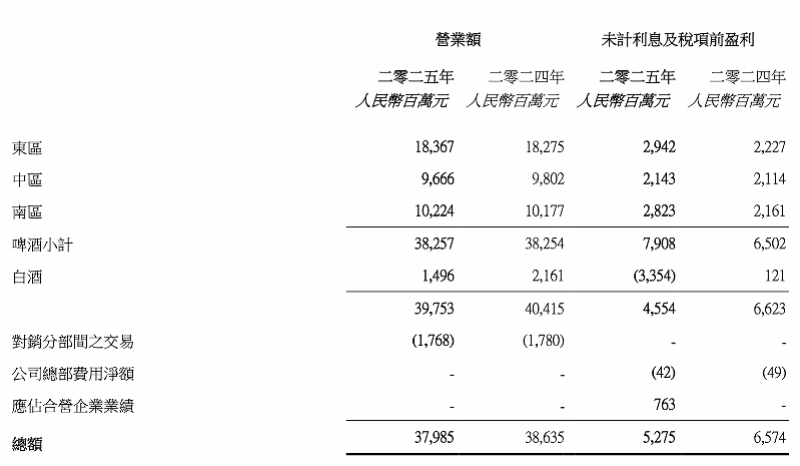 年报数据显示,2025年华润啤酒啤酒销量达1103万千升,同比增长1.4%,高端化仍是驱动增长的主要因素;该业务的息税前利润(未计利息收入、财务成本及税项前盈利)为79.08亿元,2024年为65.02亿元,同比增长21.62%。