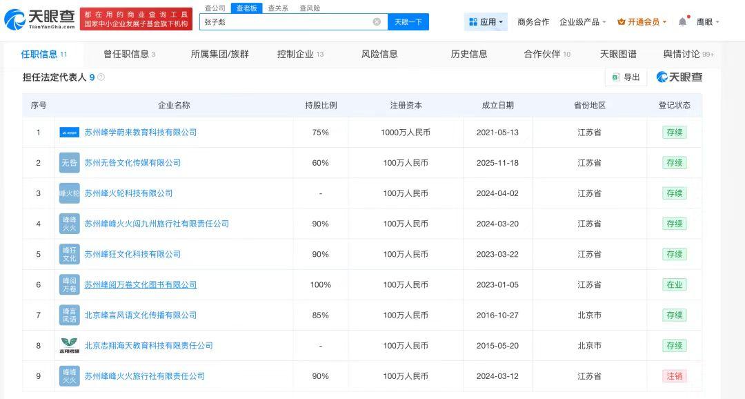 峰学蔚来的商业模式根本上建立在张雪峰个人身上。他担任苏州峰学蔚来等9家公司的法定代表人、执行董事或经理职务,名下关联企业共11家。企业的流量、课程的信任背书、家长和学生愿意付费的核心原因,都源于“张雪峰说的”这四个字。