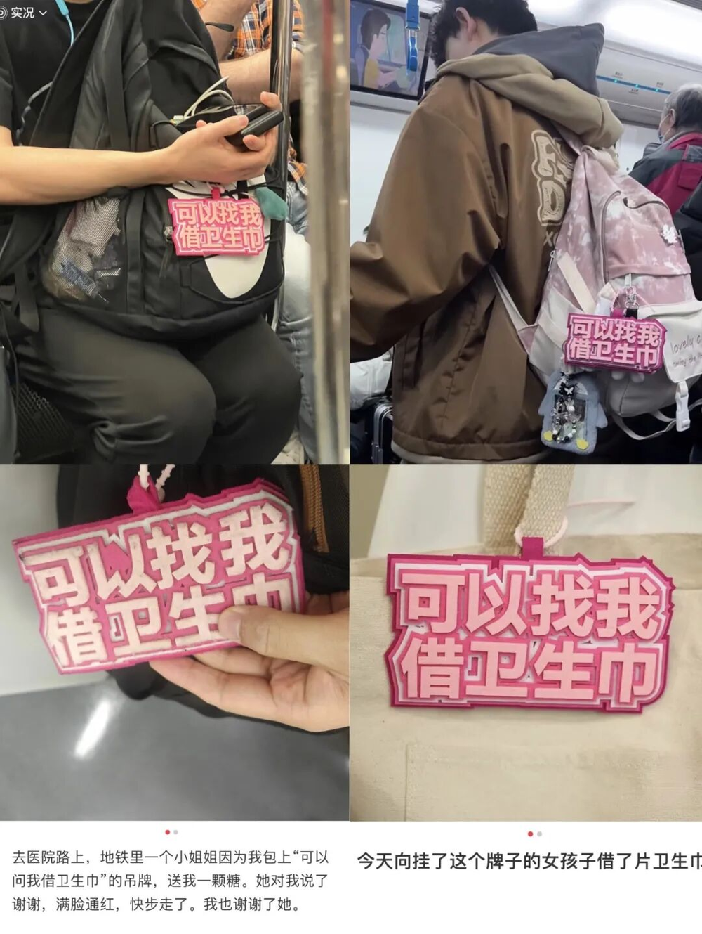 (“可以找我借卫生巾”挂件近年来持续引发讨论)