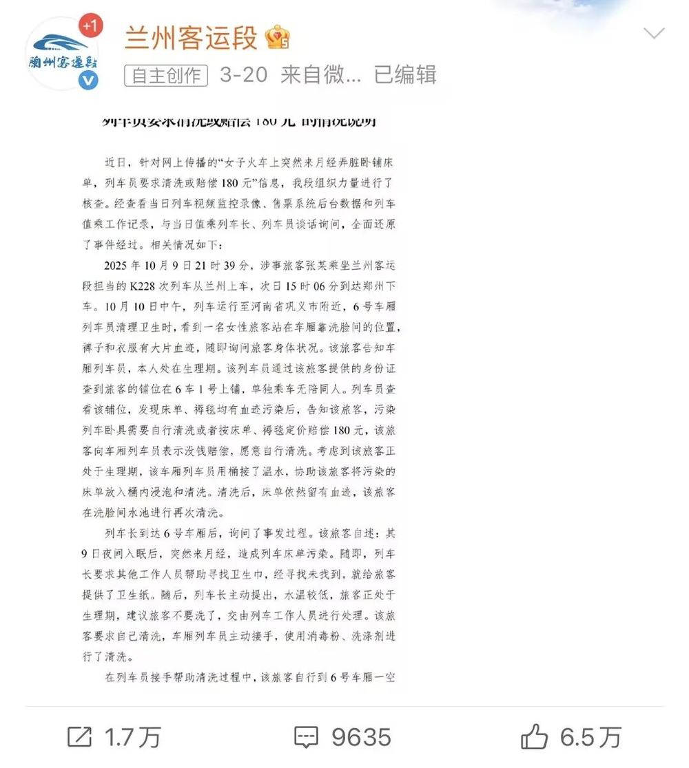 原本呼吁火车售卖卫生巾的帖子,经多次传播解读引发大规模讨论,兰州客运段近日也发布官方通报,回应事件中的争议细节。