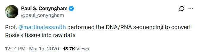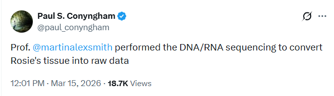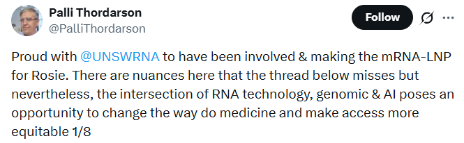 根据保罗在X平台发布的帖文:Martin Smith博士进行了DNA/RNA测序,将Rosie的生物组织转化为可分析的原始数据,Palli Thordarson教授则带领团队完成mRNA疫苗的设计与组装。Palli Thordarson教授本人也在社交平台上证实了这一点,并表示:“RNA技术、基因组学与AI的交汇,为医学实践带来了改变的可能,也让医疗更加公平。”