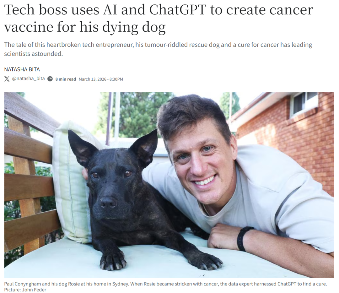 近日,澳大利亚程序员保罗·康宁哈姆(Paul Conyngham)借助AI开发“定制癌症疫苗”,成功救治晚期患癌爱犬Rosie的故事在社交平台广泛传播。OpenAI总裁Greg Brockman、DeepMind CEO Demis Hassabis等科技界人士相继转发,称其为“AI帮助普通人跨越专业壁垒”的里程碑案例。